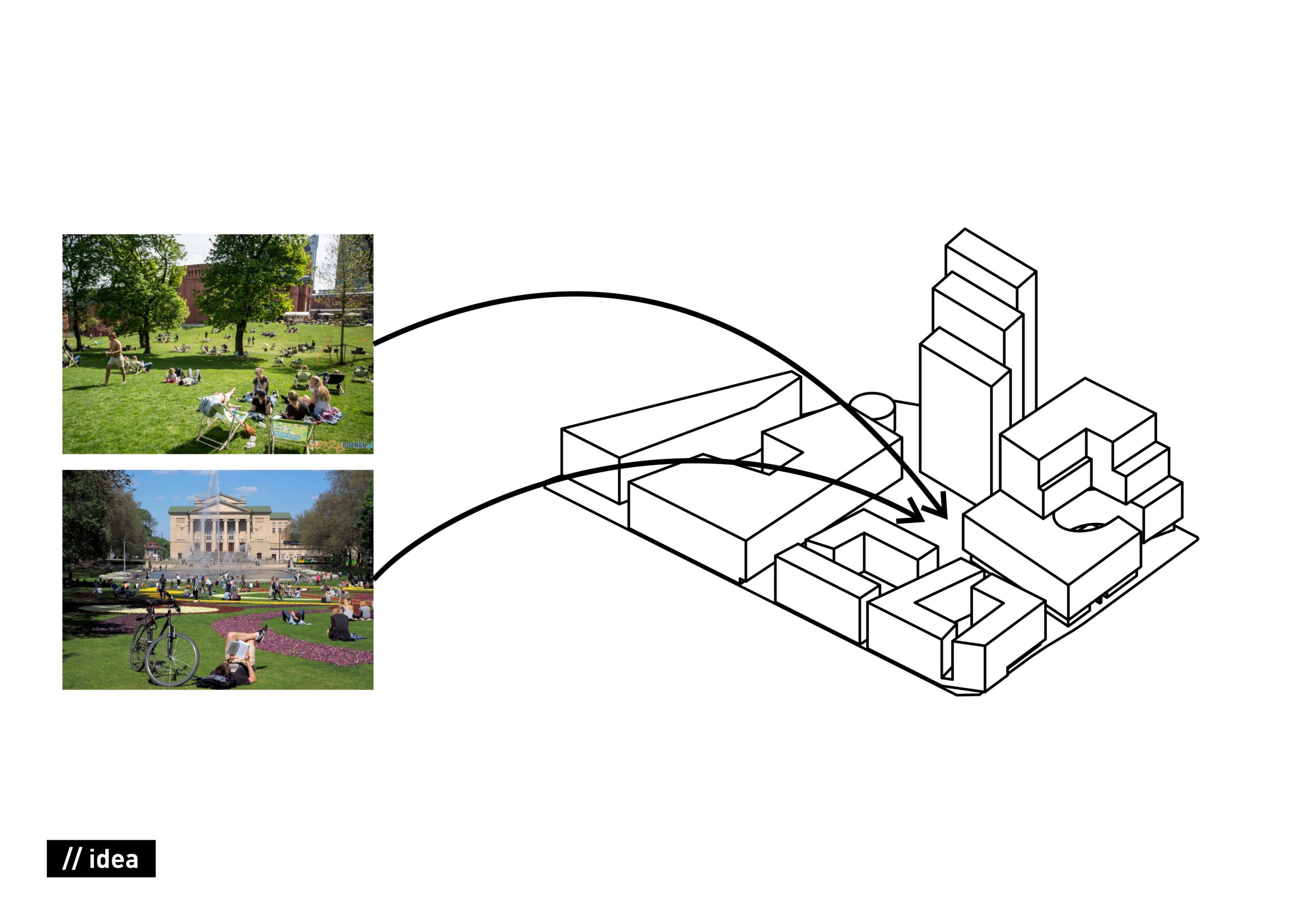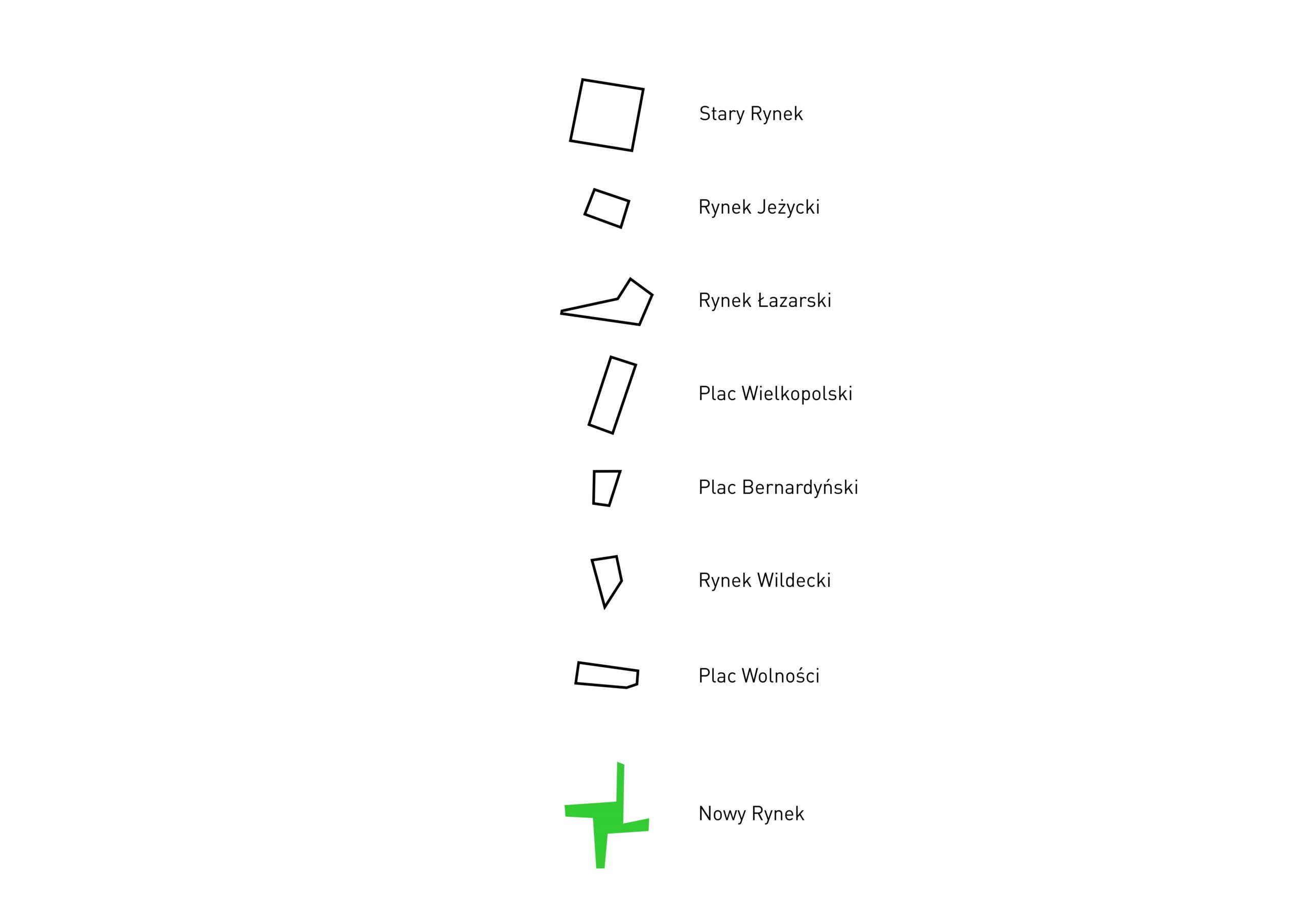 Przystępując do projektowania, ponownie przeanalizowaliśmy, nie tylko rynki i place, ale również inne przestrzenie publiczne w Poznaniu. Analiza zakończyła się wnioskiem, że większości przestrzeni jest bez życia po godzinie 17:00, po za tymi które wypełnia zieleń! wystarczy popatrzeć na parki obok Starego Browaru, przed Operą, czy na Cytadeli.