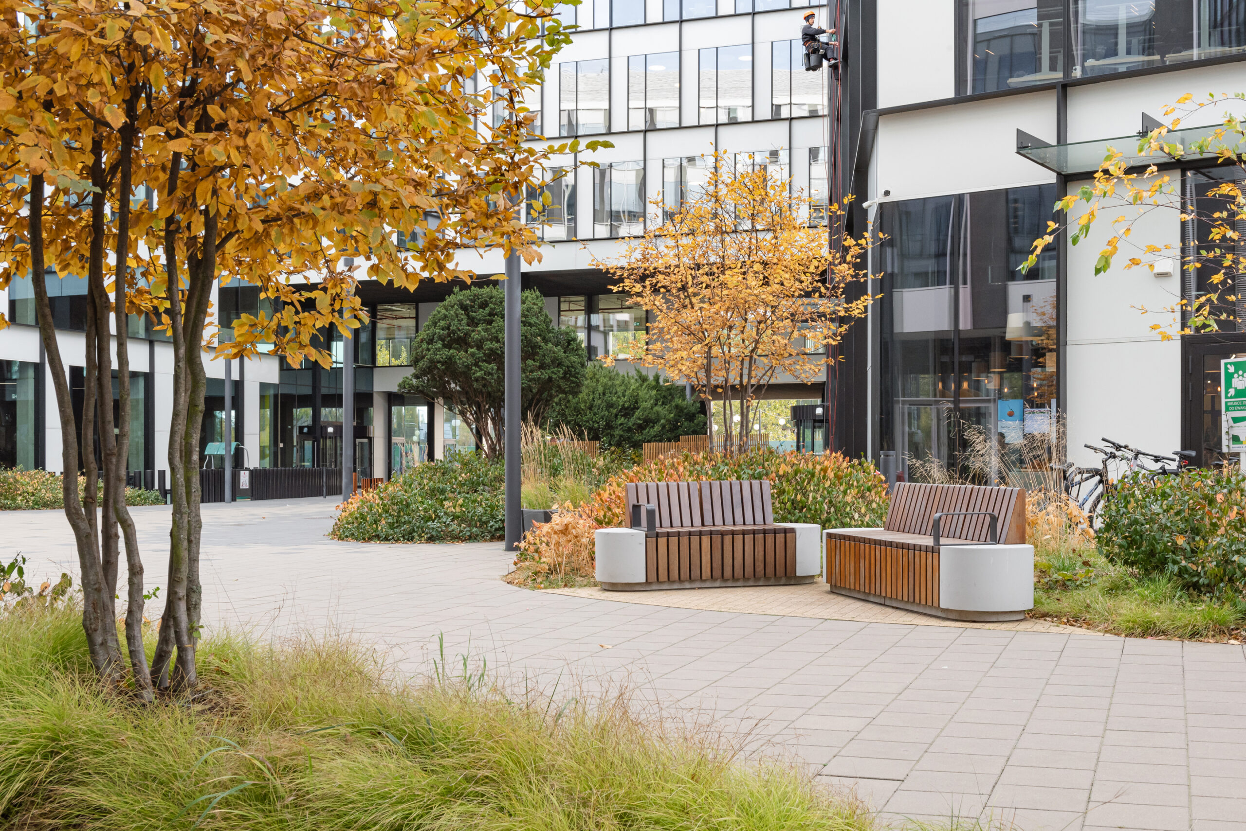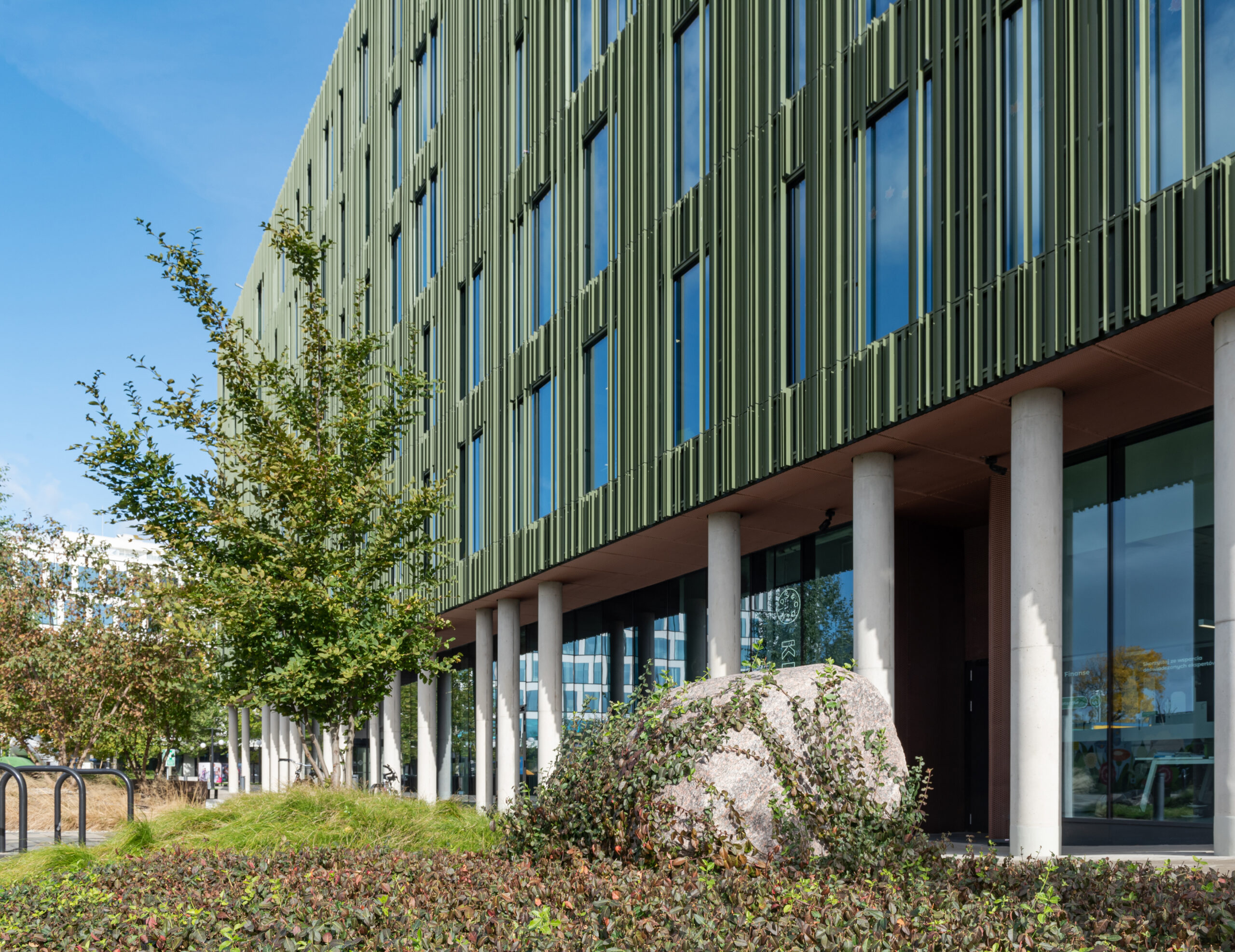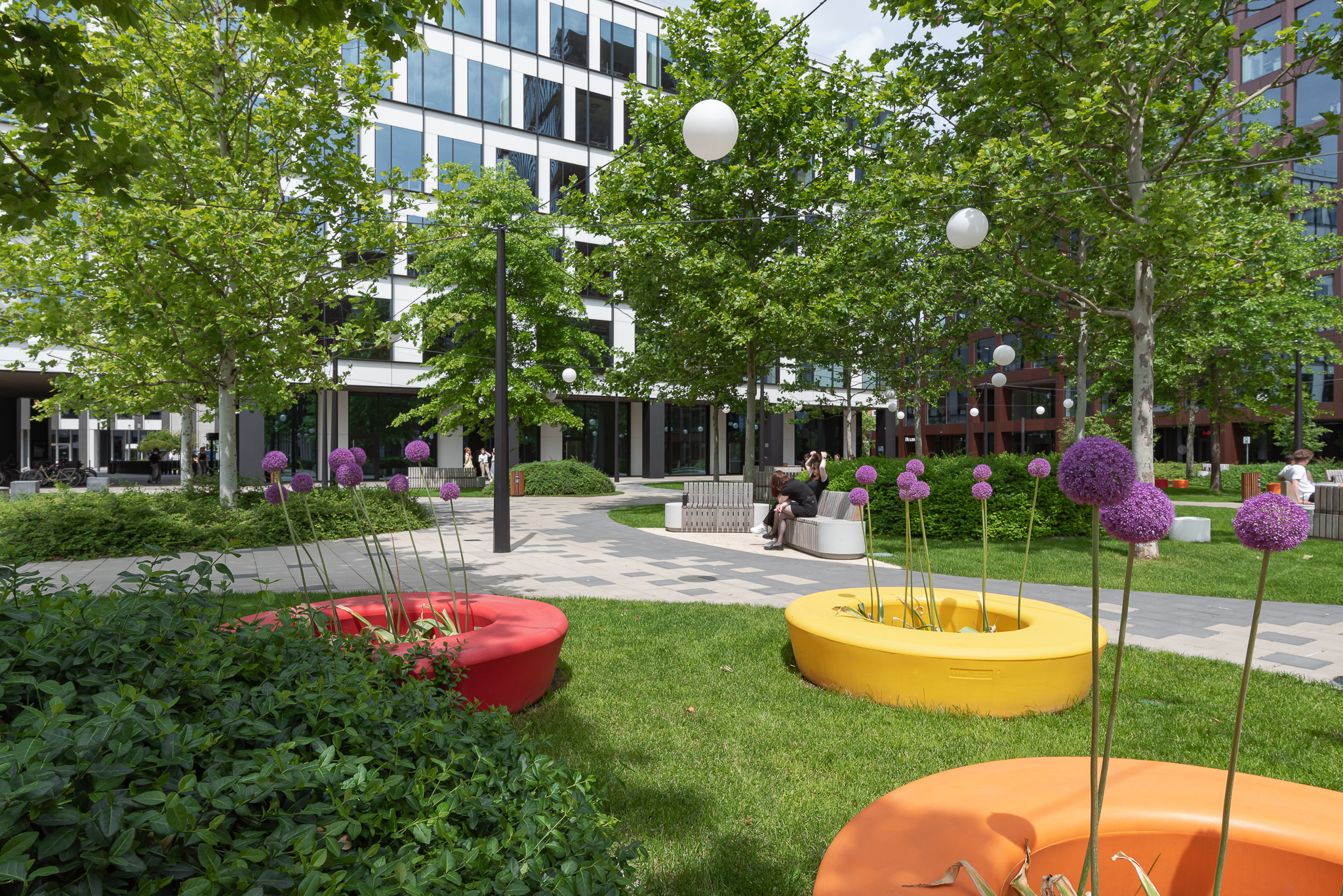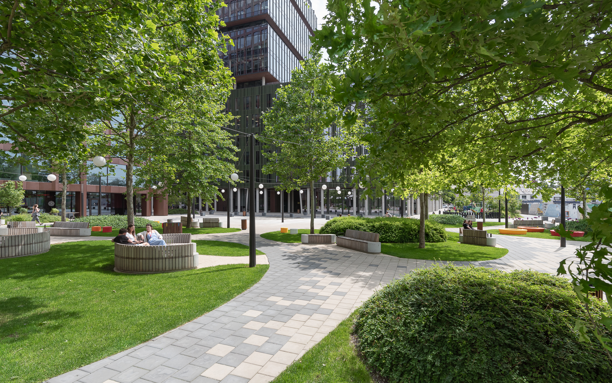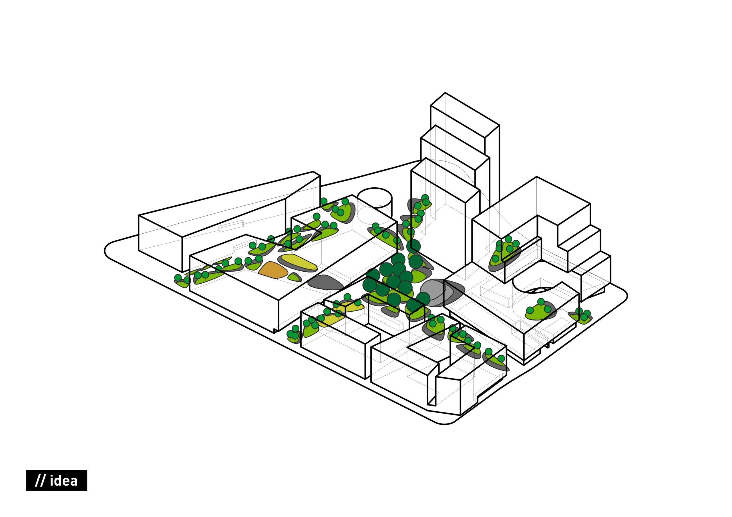 Zaproponowana przez nas forma zieleni w postaci obłych wysp kontrastuje z ostrymi kształtami kwartałów pracowni Jems Architekci. Z drugiej strony miękkie kształty można łatwo modyfikować, a pracująć nad koncepcją nie wiedzieliśmy jak bedą wyglądały kolejne etapy inerstycji. Zielone wyspy mają formę „górek” porośniętych zielenią niską (krzewy, byliny i rośliny cebulowe) oraz drzewami.