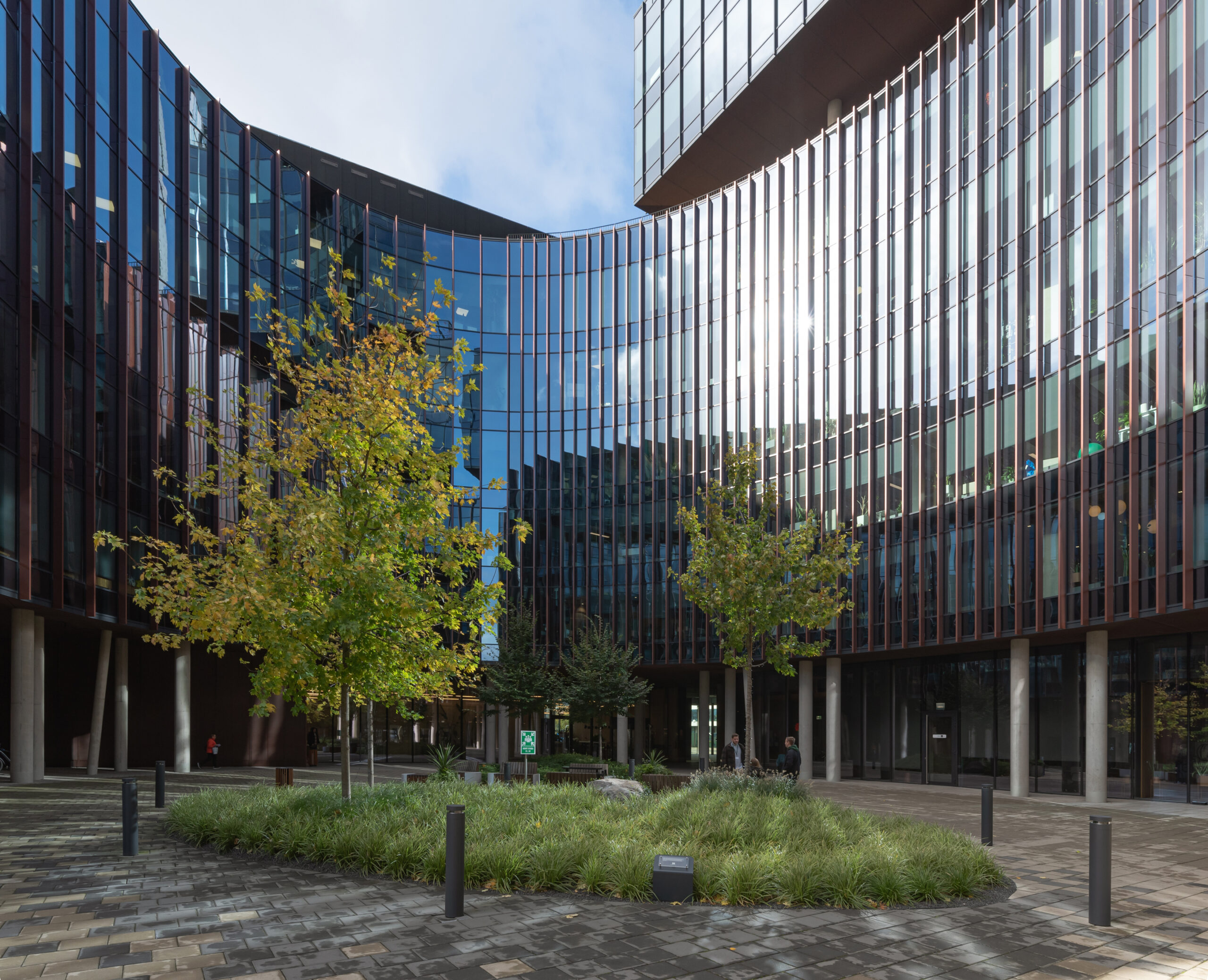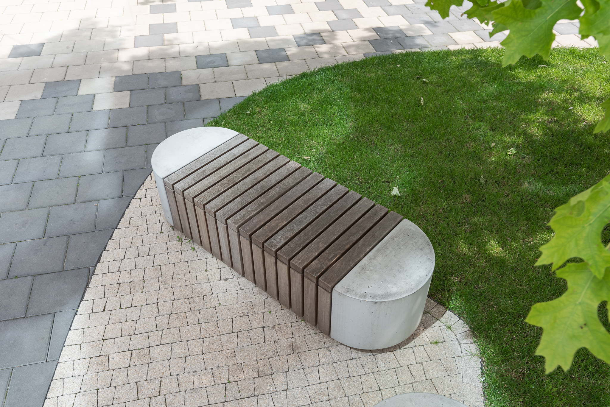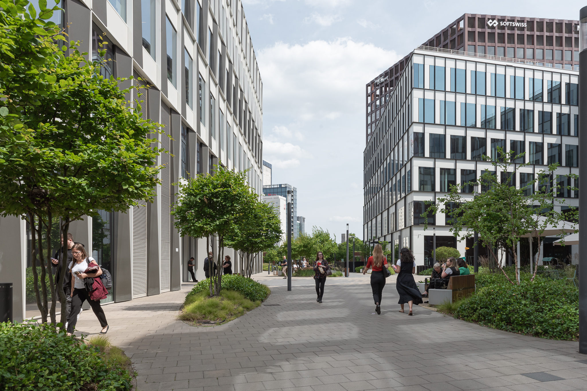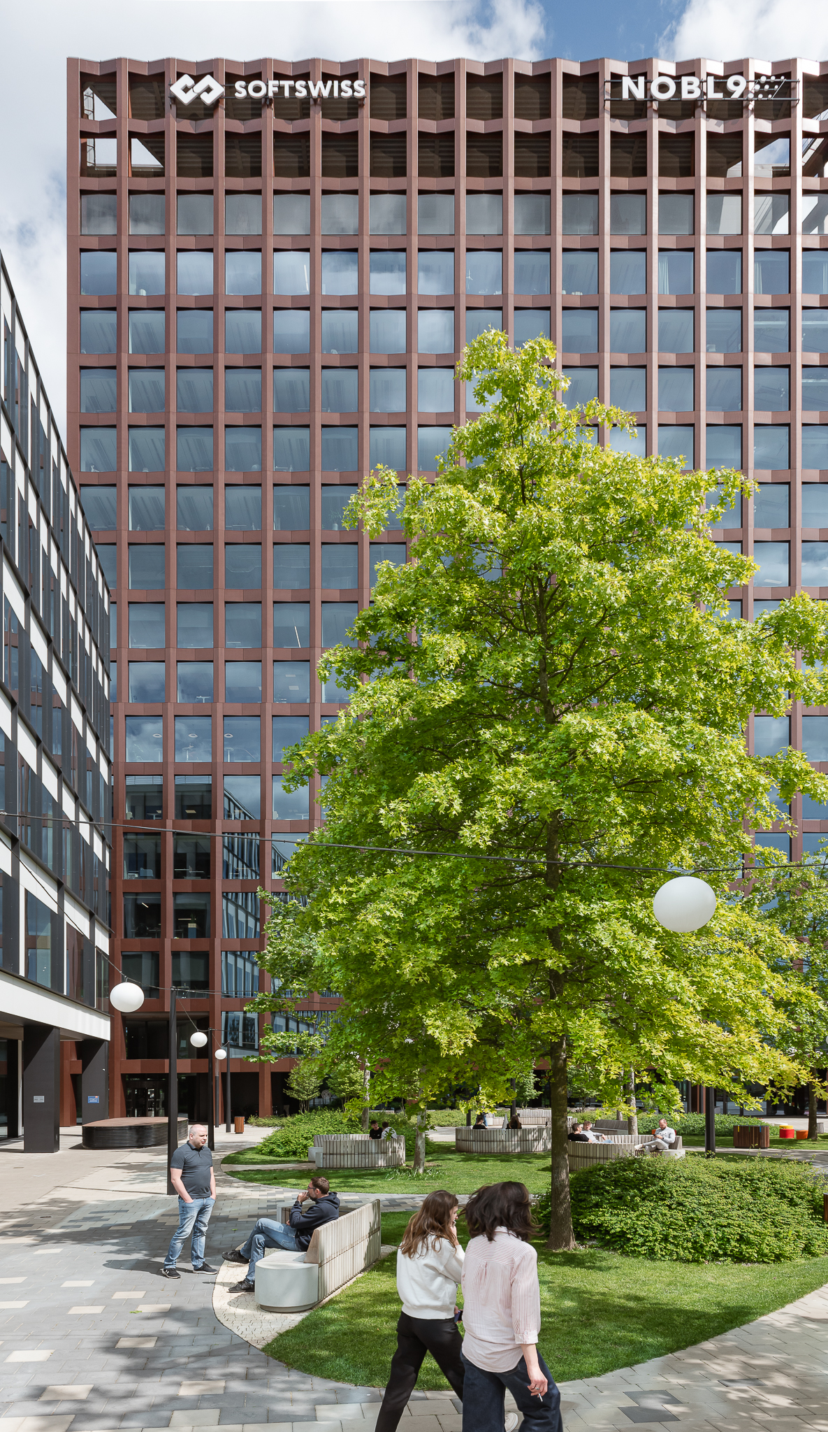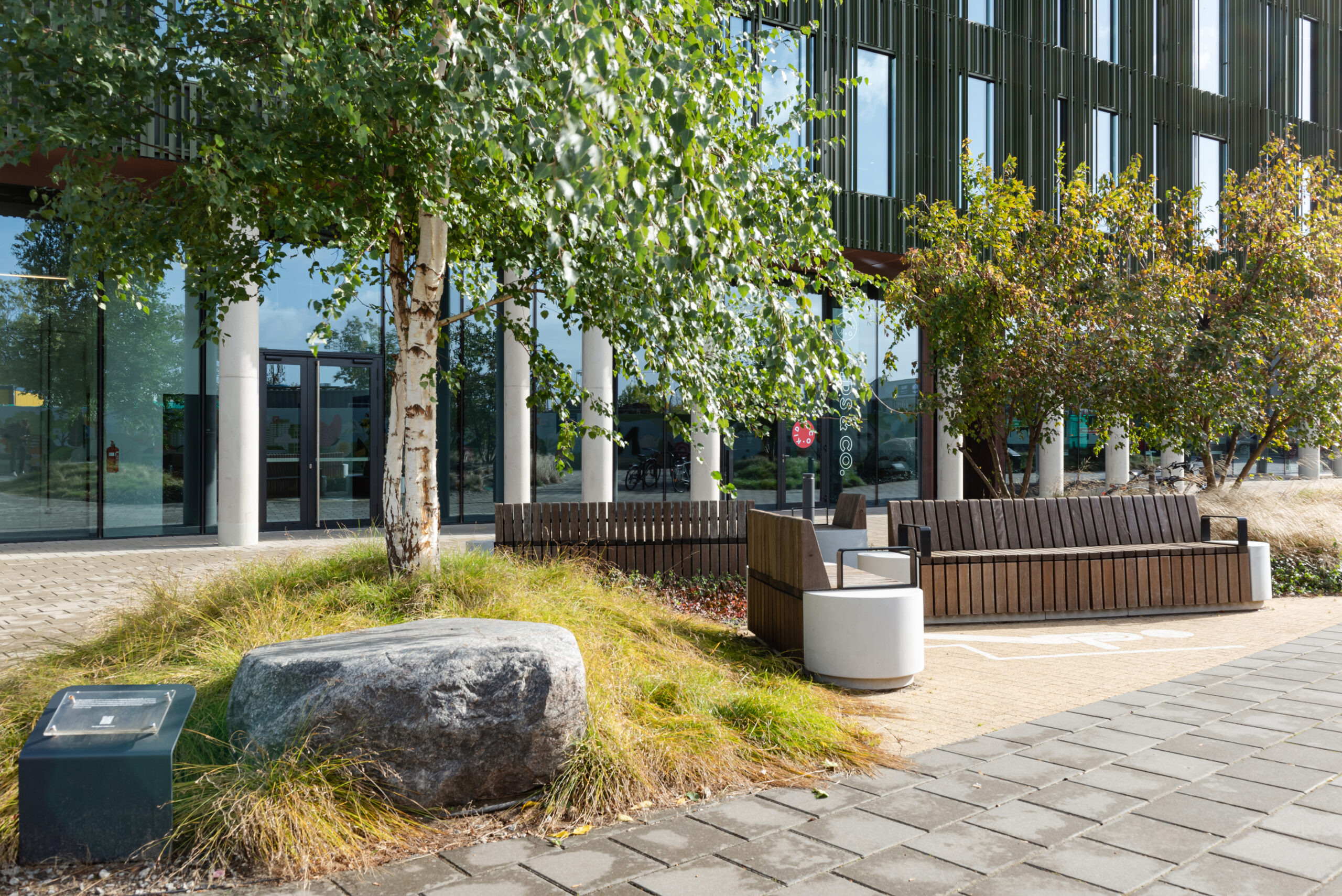 Zaproponowana przez nas forma zieleni w postaci obłych wysp kontrastuje z ostrymi kształtami kwartałów pracowni Jems Architekci. Z drugiej strony miękkie kształty można łatwo modyfikować, a pracująć nad koncepcją nie wiedzieliśmy jak bedą wyglądały kolejne etapy inerstycji. Zielone wyspy mają formę „górek” porośniętych zielenią niską (krzewy, byliny i rośliny cebulowe) oraz drzewami.