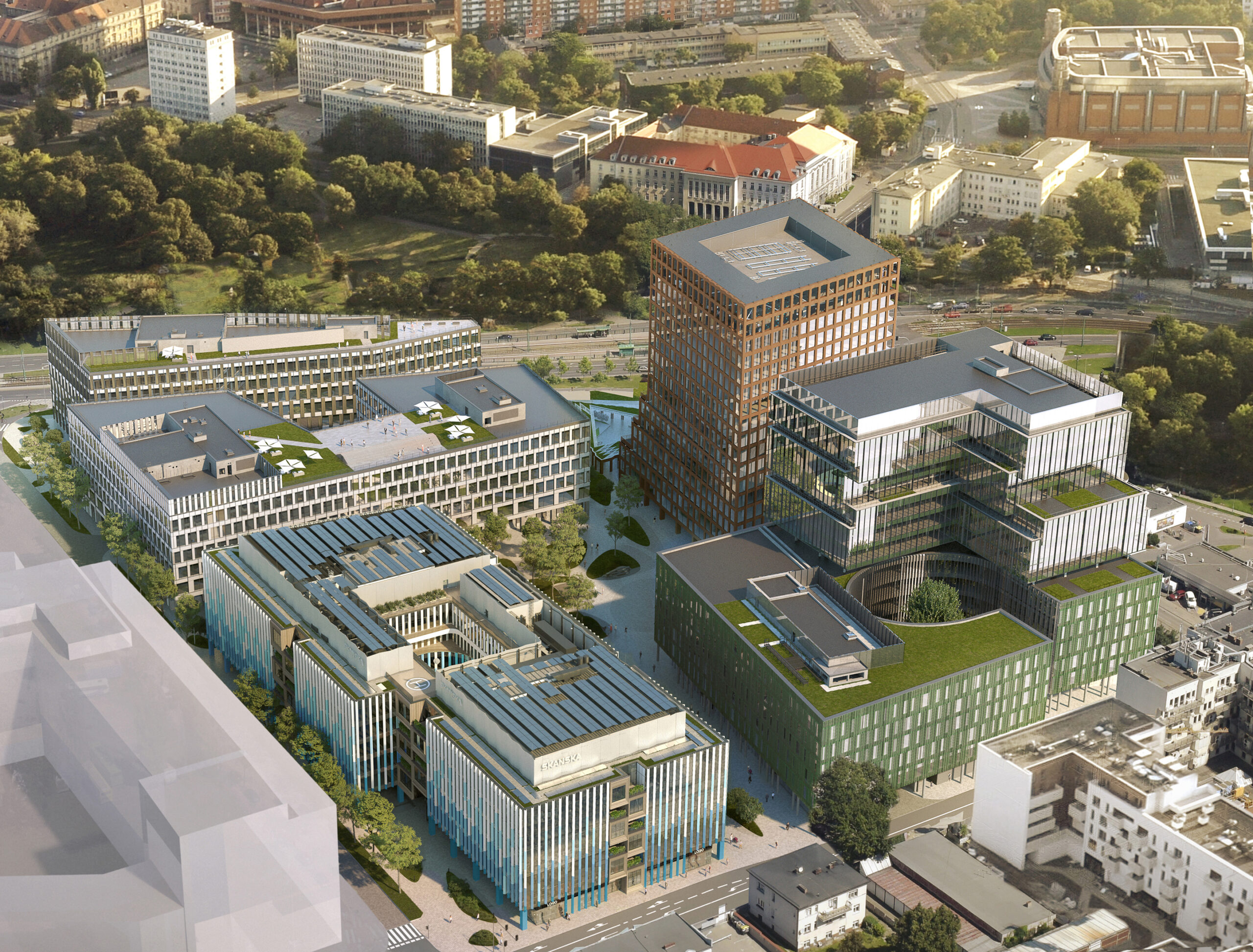 Prace nad koncepcją zagospodarowania rozpoczęliśmy już w 2017 roku i było to dla nas niezwykle ciekawe doświadczenie. W trakcie realizacji wcześniejszych etapów inwestycji, na tym terenie znaleziono duże głazy. Te głazy przyniósł ze Skandynawii przed tysiącami lat lodowiec. To właśnie one stały się inspiracją dla kształtowania tych elewacyjnych akcentów. Chcieliśmy, by fragmenty elewacji wyglądały tak, jakby budynek symbolizujący lodowiec niósł je w sobie. Przy okazji warto dodać, że wszystkie wykopane głazy można dziś znaleźć wkomponowane w przestrzeń Nowego Rynku. Te fragmenty elewacji mają też tworzyć ciekawe przestrzenie dla użytkowników biur – są zewnętrznymi, zielonymi tarasami, a jednocześnie mogą stać się atrakcyjnymi częściami wnętrz, miejscami wypoczynku i spotkań. Ich geometryczna forma nawiązuje natomiast do dawnego budynku dworca PKS, który przez wiele lat stał w tym miejscu. Jego elewacja była częściowo pokryta charakterystycznymi kasetonami, przypominającymi ramki na zdjęcia.